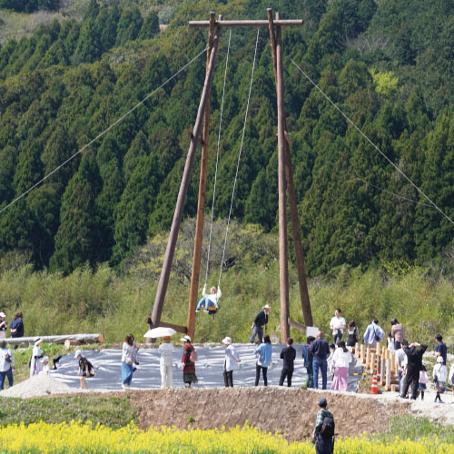 花畑の中に飛び込む感覚が味わえる巨大ブランコでひまわり風景を楽しもう!!