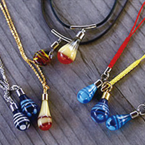 ガスバーナーを使ったガラス細工体験。初心者にも易しく、短時間でストラップやペンダントができる。