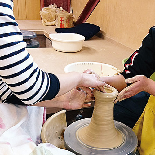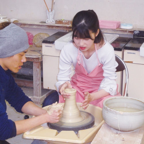 プロの職人による吹きガラス制作体験。約3ヶ月ごとに内貫入ガラス、みどり玄武岩ガラスと素材が変わる。